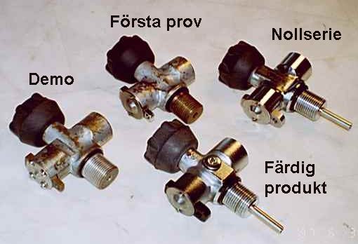 Produkten är ett stort tekniskt framsteg, säkerhetshöjande. Exporteras till bl a Norge. På bilden visar jag hur produkten växer fram ur en hel serie med prototyper. I texten nedan förklarar jag gången i hur en sådan framtagning fortskrider. |