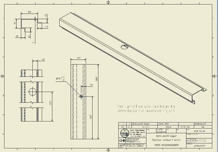 DetaljritningarI ingenjörsvärden råder principer om hur man skall utforma ett ritningsunderlag. Varje ingående komponent skall ha sin detaljritning. Ritningen här bredvid är över en plåtdetalj. Detaljen visas även plan (såsom före kantbockning), detta för att undrelätta vid klippning eller laserskärning. |